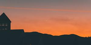 Steeple Silhouette: Moon-Kissed Sunset in Cinematic Frame